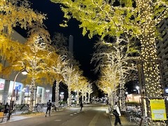 Xmasの飾り付けが町のあちこちで始まりました。銀杏並木にもイルミネーションの明かりが灯って気分は盛り上がります。まだ銀杏の黄色い葉が残っているのもご愛敬。若者にとってはお正月よりクリスマスの方が熱心かも。宗教ぬきで楽しいのでしょう。私にはやはり、お節を食べて祝うお正月は格別です。