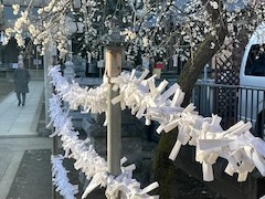 神社の境内。梅の木の下に、沢山のオミクジが結びつけられています。年の初めには、吉凶を占って自分の運命を知りたくなるもの。仕事や結婚だけでなく、受験も間近なので、吉を引けるか大いに気になるところです。夢を実現したいという思いが、この白いオミクジの光景なのですね。みなさんがうまくいくといいですね。